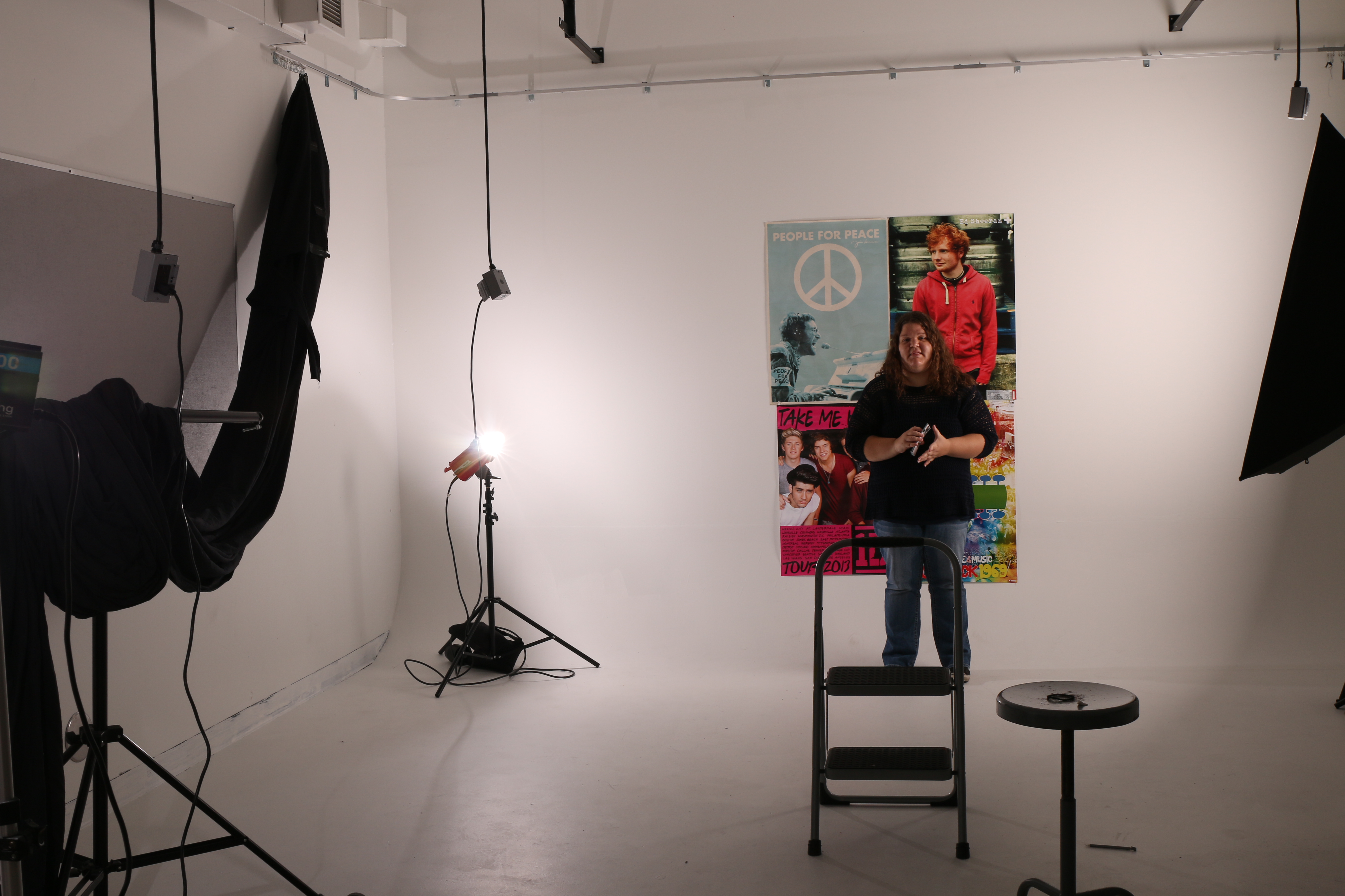 Lauren: Set up as shown, Main light being the strobe in the right with a soft box. Back left light was adjusted to minimize shine on background images. The difficulty with these background images is sheen off the posters that the light causes. I found that I liked the images more when the subject didn’t look completely separated from the background (so I avoided the rim light and tried to create soft lighting on the left side of the model that gave light, but no reflection off the backdrop image).