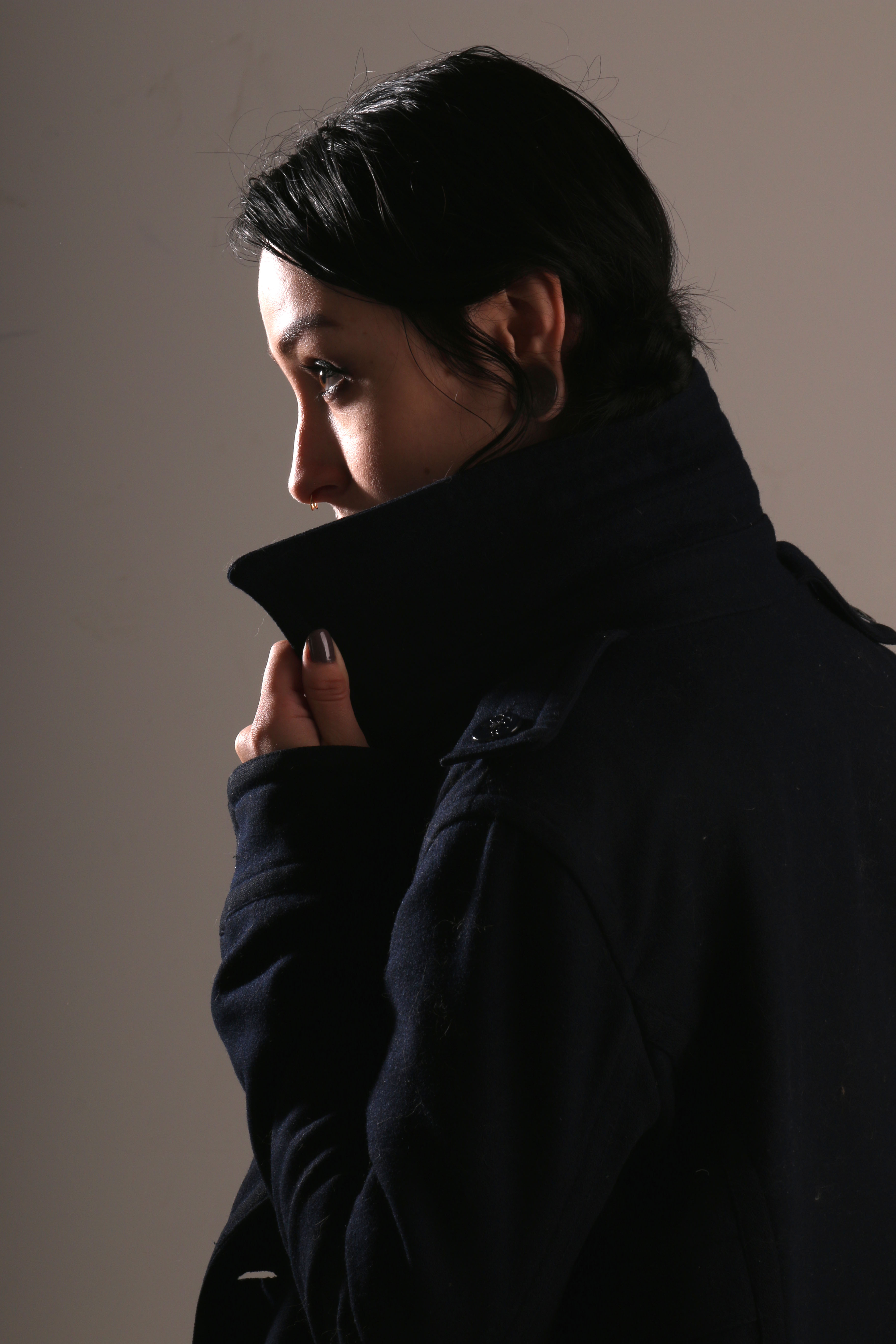 Baylen Brown poses in studio on October 6, 2014 showing off the collar of a coat.