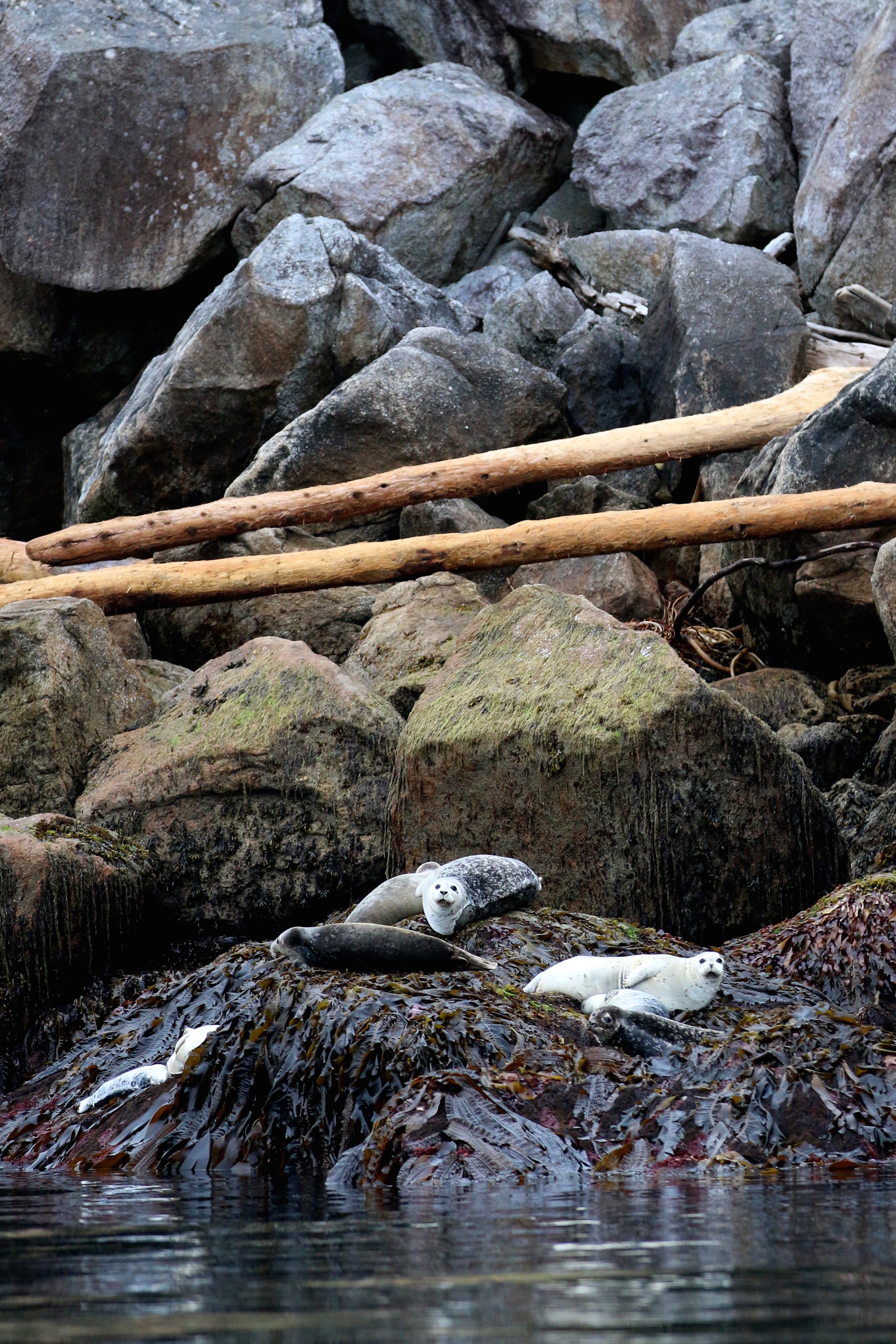 Erin and I eventually attempted to take a hike to the waterfall, only to be disappointed by the crazy thick foliage that stopped us form even getting close. We decided to sit on the rocks and hang out for a while, taking in the view before us. We were on the side of this lovely cove that we were going to call home for a few days. We had a Harbor Seal pop up and visit us, and Erin and I joked about the black bear that had been spotted around here showing up. When I took my 70-200 lens off and switched to my 24-70, I told her to jokingly be on the look out for the blackie because if it were to show up, it’d obviously be when I took my telephoto lens off. When she whipped around and hit me on the arm, I didn’t believe her as she pointed towards the hill we just attempted to climb over and said “there it is!” She wasn’t kidding. The tress were moving, splitting as something big and burly moved beneath them. We couldn’t see even a glimpse of the creature, but we knew it had to be the bear. A moose would have been tall enough to see through the brush, and a human wouldn’t make such a ruckus. We waited, and as the mover seemed to exit the hill, we watched. we watched to see seemingly nothing – the grass over the wetland area was too tall to show the creature as well. But then, he appeared (*disclosure, definitely could have been a she as well). He walked across the water fall area as Erin and I held our breaths and slid back on the rocks, hoping to cover ourselves a little by the over hanging trees. We wanted to watch the bear, not disturb it or make it nervous. we knew that he knew we were there, for one, he could smell us because we were so close, and he also glanced at us once for a short second, only to look away and continue on his path. He was truly beautiful – thick glossy coat, just moving through the scenery that he belonged in. If I wasn’t there to see this encounter happen from beginning to end, I wouldn’t believe that this happened in such magical setting. It seems unreal (as most things here do). As he crossed, he was again covered by the tall grass, and we never saw him again.