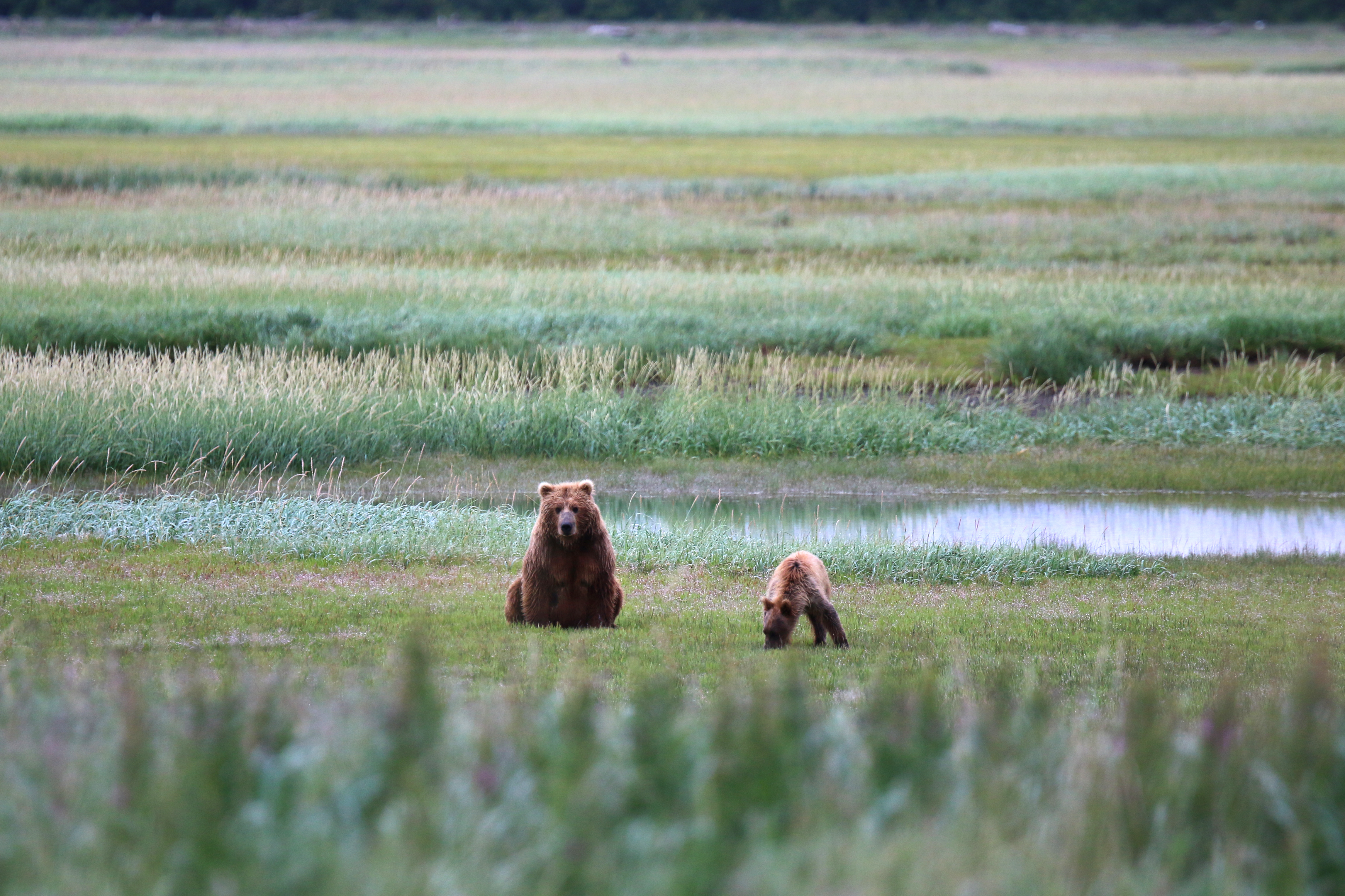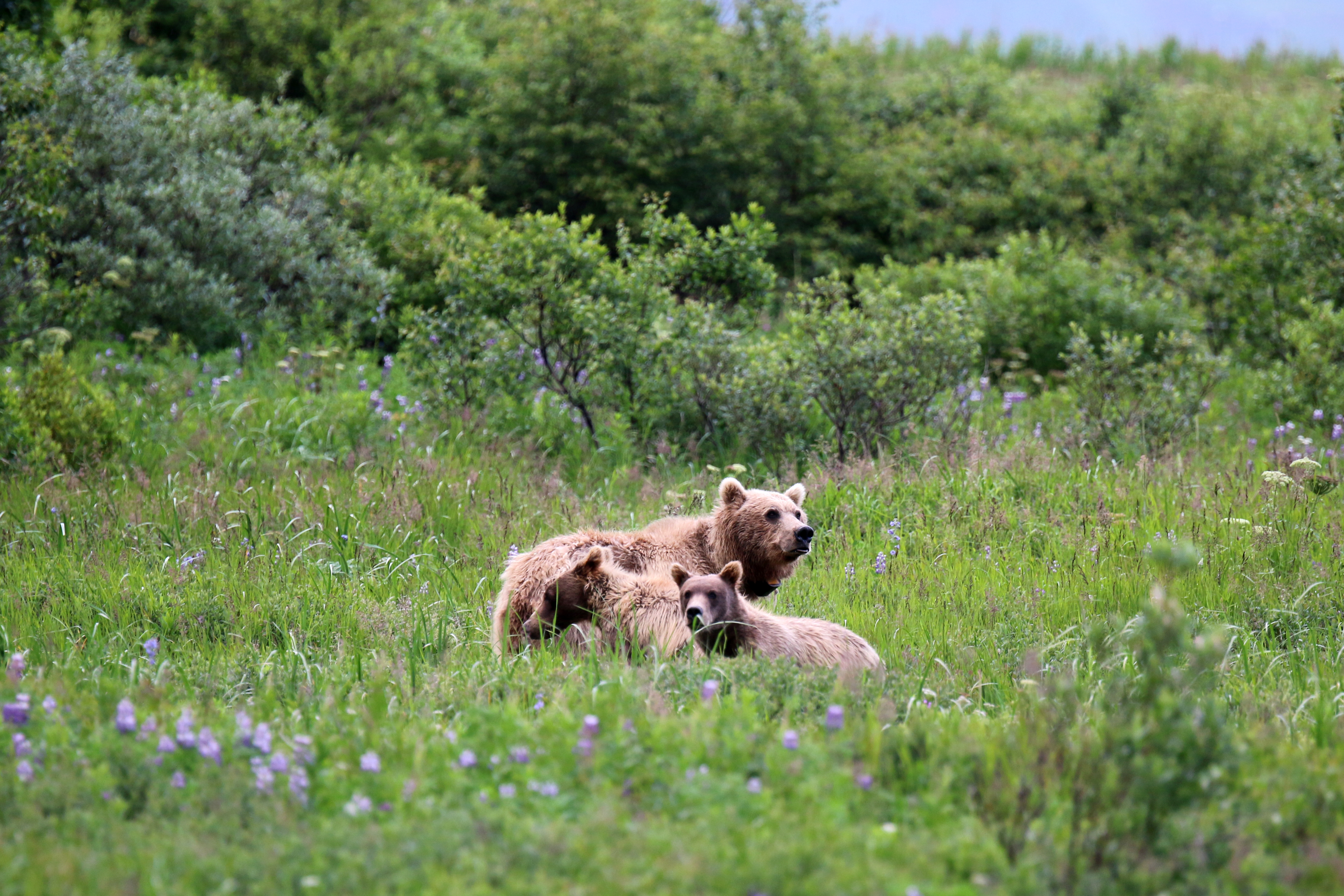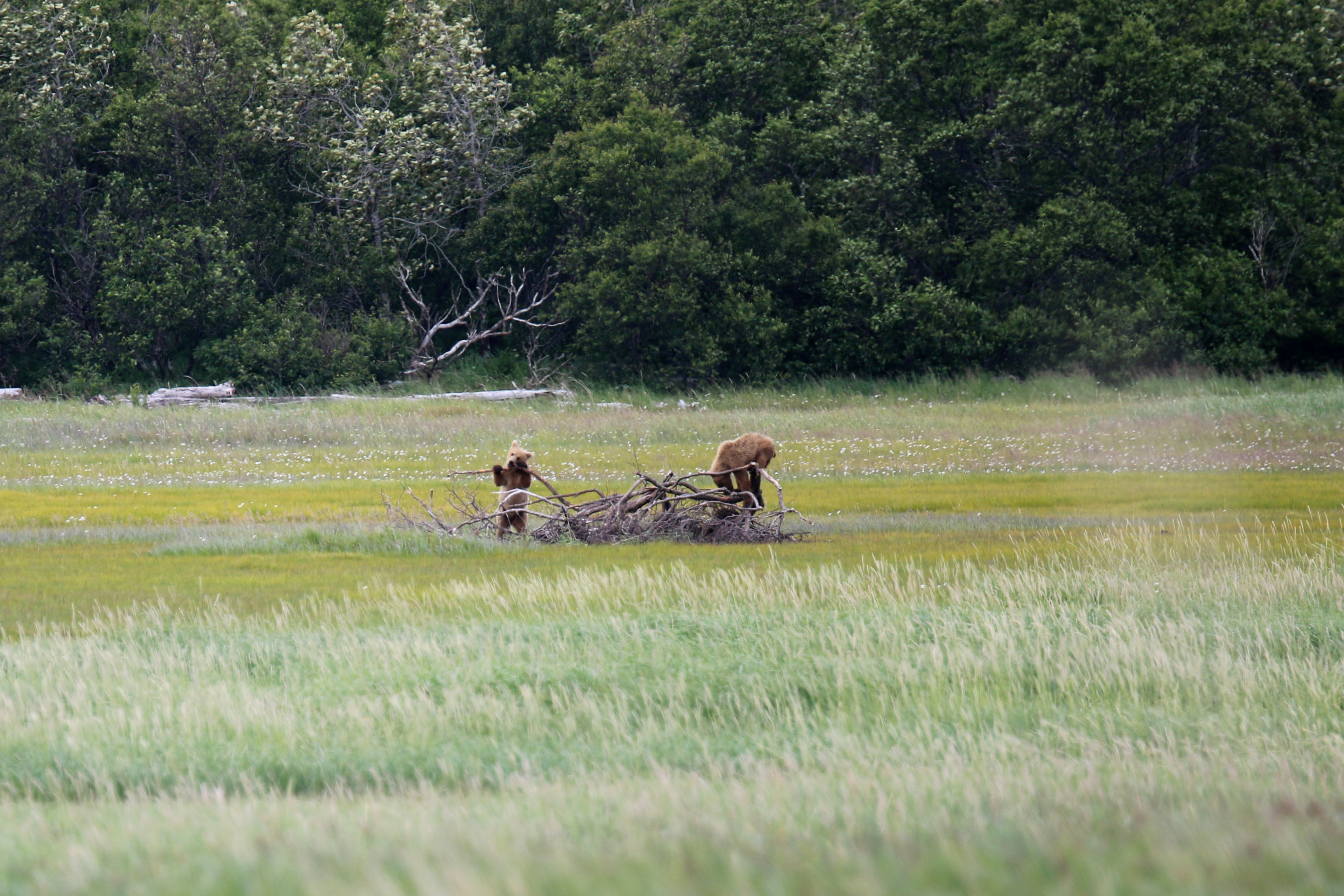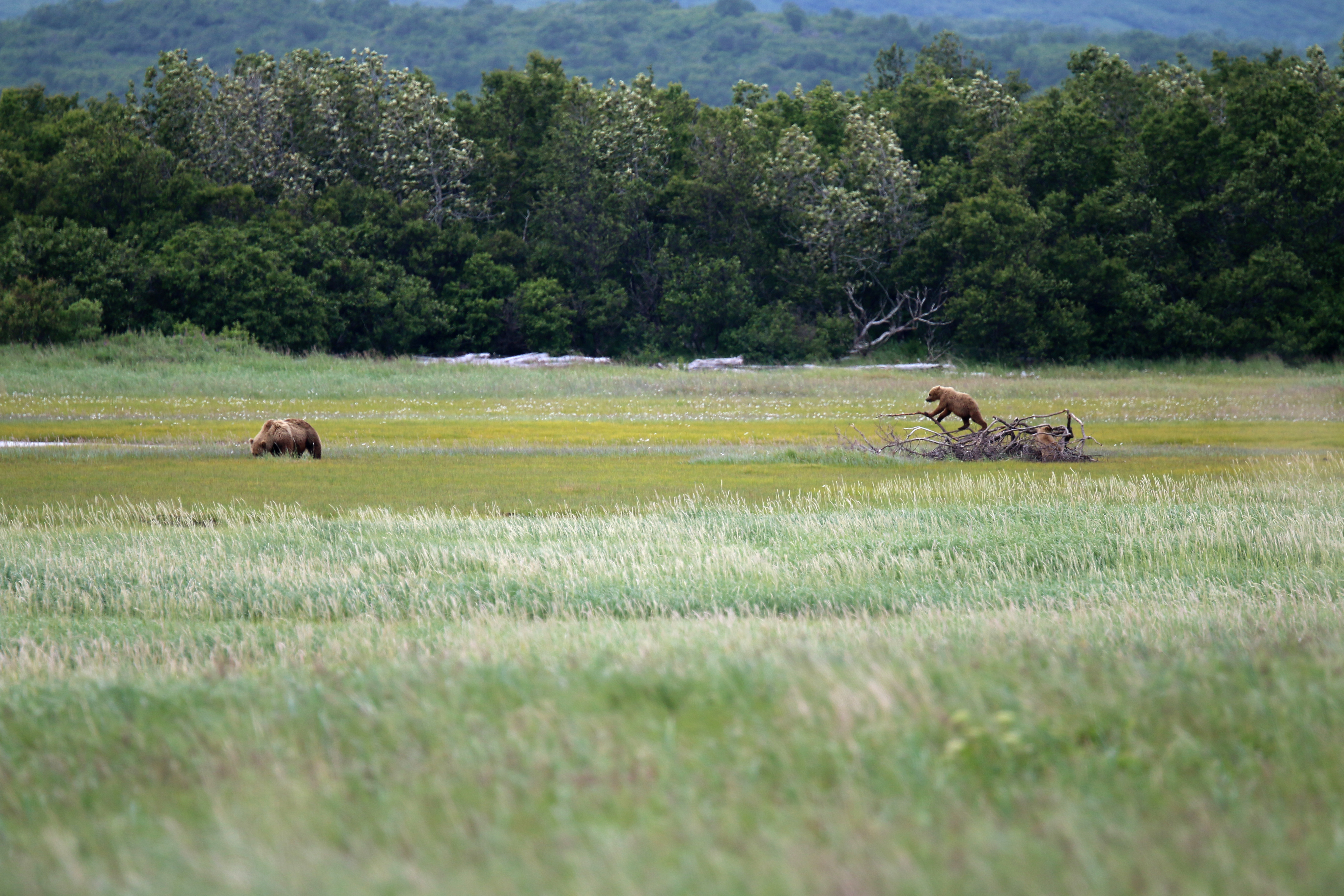 I loved watching a sow and her two young cubs out in the meadow. Her cubs were under a year old, and rambunctious to say the least. The mother almost had a tinge of annoyance about her when the cubs sprinted in front of her and started wrestling. At one point, the two youngsters had discovered a pile of wood. Well, more like they crashed into while wrestling. They crawled all over it, carefully testing how much weight the branches could hold with their paws. The mother sat a distance away, and at one point absolutely just turned her back away from them and watched off in the other direction. When she had enough waiting for the two she stared at them for 20 seconds, seemingly scolding them. They both slowly crawled of the wood pile, and walked slowly, heads hanging, to their mother who was already making her way down the path.