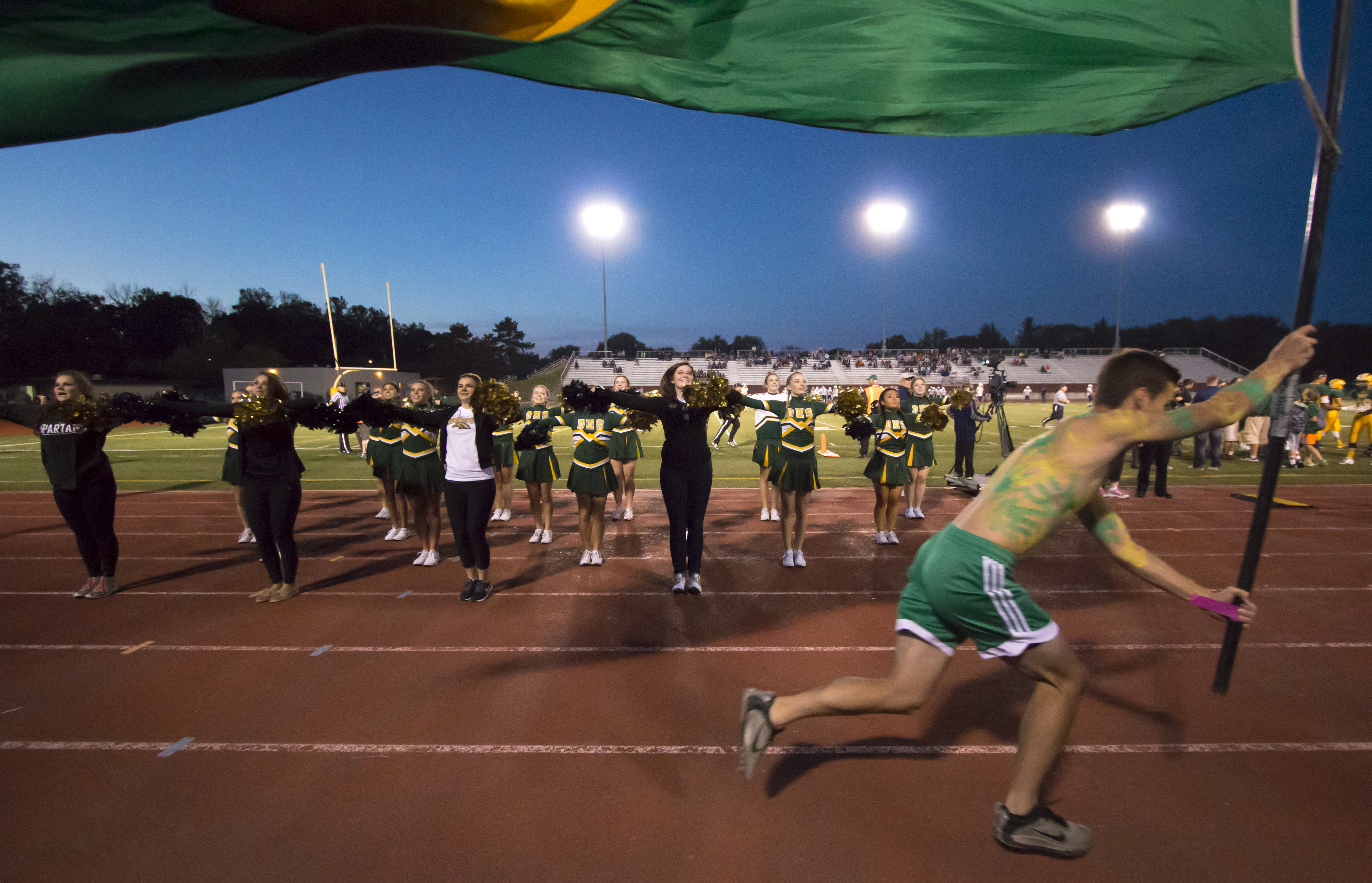Midland, Michigan native Lauren Rabine, center, performs the charger fight song with the current H. H. Dow Varsity pom pon team and other alumni during the homecoming game on Sept. 25, 2015. Rabine, who has been pomming consecutively for eight years and graduated from H. H. Dow in 2011, returned to her alma mater this year to be the assistant coach of the varsity team after stepping down from pomming professionally.