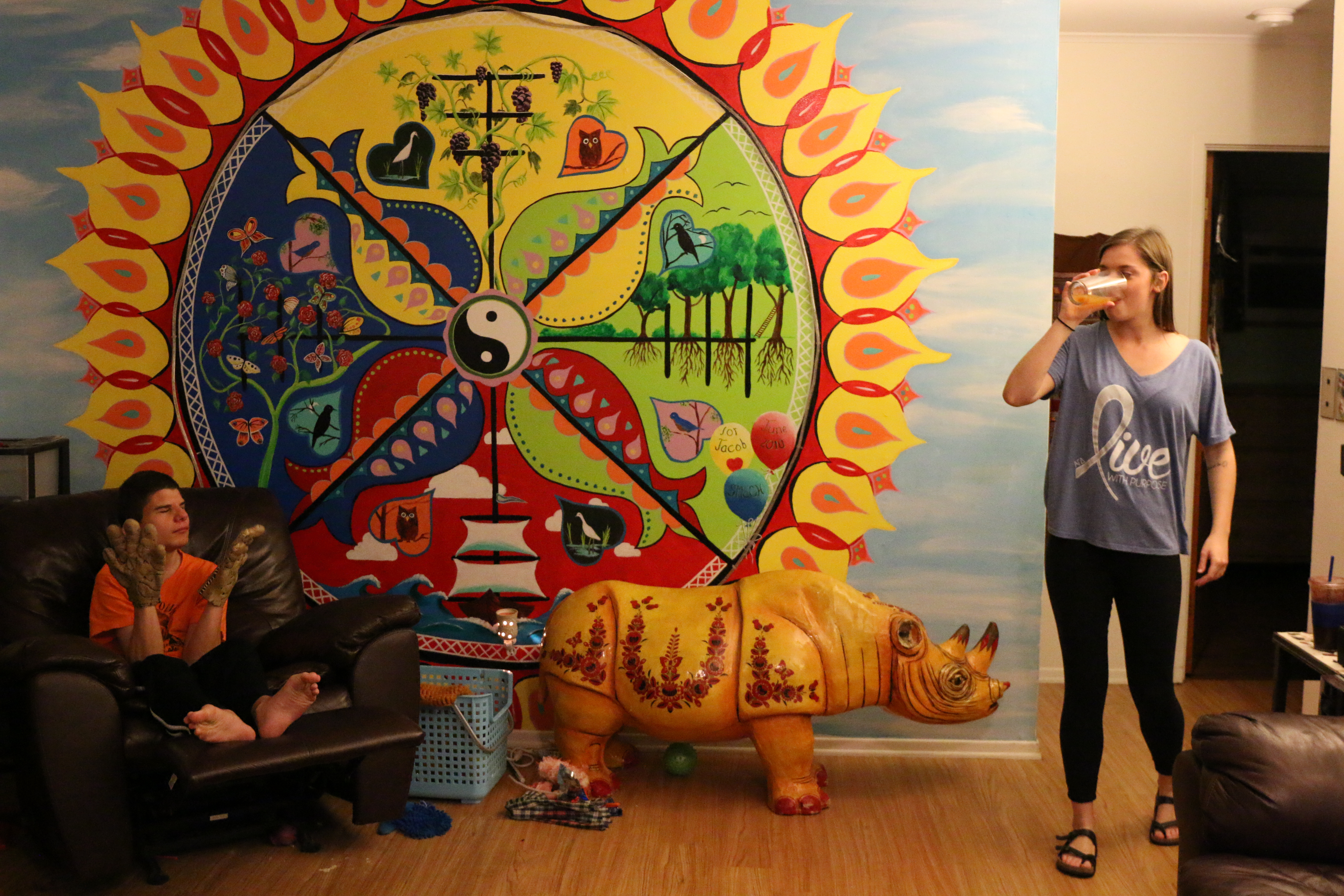 Emily Lane-Waters, a junior at CMU, lays on the front lawn with Jacob Hartshorne, a 26-year old man with CHARGE syndrome on Monday, Oct. 27, 2015. Jacob, who is deaf and partially blind has caretakers with him 24 hours a day in his home in Mount Pleasant, Michigan.Emily Lane-Waters updates the staff notes in the room dedicated to the twelve care givers that work with Jacob Hartshorne through out the week on Nov. 3, 2015. The caretakers have a room dedicated to them in Jacob’s home, so the over night caretaker has a place to sleep.Emily Lane-Waters prepares a meal for Jacob Hartshorne in his kitchen on Nov. 3, 2015.Emily Lane-Waters cleans up an accident left on Jacob Hartshorne’s floor on Nov. 3, 2015.Emily Lane-Waters, a junior at CMU, holds Jacob Hartshorne’s hand, a 26-year old man with CHARGE syndrome, on Monday, Oct. 27, 2015. Jacob had been suffering form an intense ear infraction, and when he showed signs of discomfort, Emily held is hand and comforted him.Emily Lane-Waters returns home after working a 4 hour shift with Jacob Hartshorne on Nov. 3, 2015. “It’s a lot different from when I’m home,” she said. Emily lives Alpha Gamma Delta’s sorority house with 9 roommates.Emily Lane-Waters, a junior at CMU, jokes around with Jacob Hartshorne, a 26-year old man with CHARGE syndrome by playfully placing a hat on his head while cleaning his room on Monday, Oct. 27, 2015.Jacob Hartshorne interacts with one of his caretakers, Emily Lane-Waters on Nov. 3, 2015. Jacob’s house is full of bright colors and his caretakers share that he enjoys bright and shiny visual stimulus, like these window decorations.Emily Lane-Waters smiles at Jabob Harthorne’s choice of costume hands at halloween store on Nov. 3, 2015. Emily likes to take Jacob around town, stopping at places like tropical smoothies and halloween stores.Emily Lane-Waters smiles at Jabob Harthorne while he plays with his halloween gloves on Nov. 3, 2015. Jacob’s house is bright and colorful, and the main wall displays a bright mural.Emily Lane-Waters, a junior at CMU, walks Jacob Hartshorne, to his parent’s home on Monday, Oct. 27, 2015. “I don’t consider this work. Just hanging out with Jake calms me more than stresses me,” Emily shared.